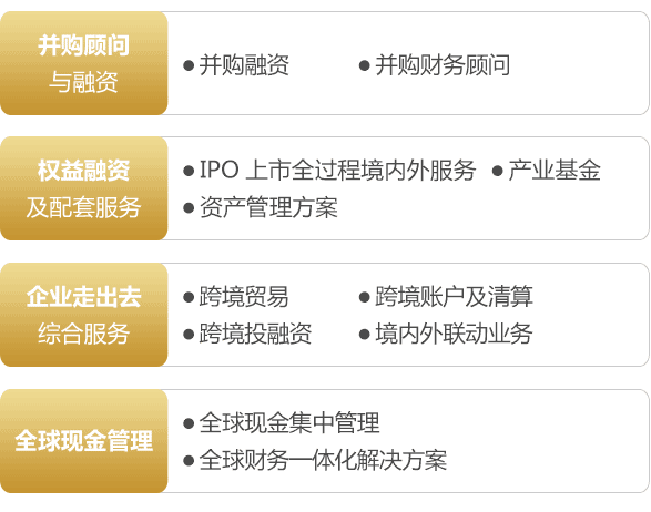 在优秀民族企业运筹全球、通达网络、投资并购的国际化进程中,离不开民族银行的随行贴身服务,综合化、国际化的交行是您的最佳选择。